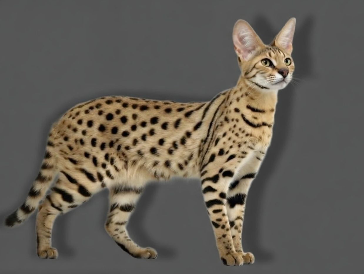 El gato Savannah es un híbrido exótico impresionante, resultado del cruce entre un serval africano salvaje y un gato doméstico, con cuerpo alto y esbelto, patas largas, orejas enormes erectas y pelaje corto moteado como un leopardo en miniatura, que le da un aspecto verdaderamente salvaje y majestuoso. Es una de las razas más exóticas y raras del mundo felino, especialmente las generaciones tempranas (F1-F2), Su personalidad es energética, inteligente y muy sociable, casi como un perro: juguetón incansable, leal, curioso, trainable (incluso para pasear con correa o jugar a fetch), ama el agua y necesita mucho estímulo mental y espacio para no aburrirse.
